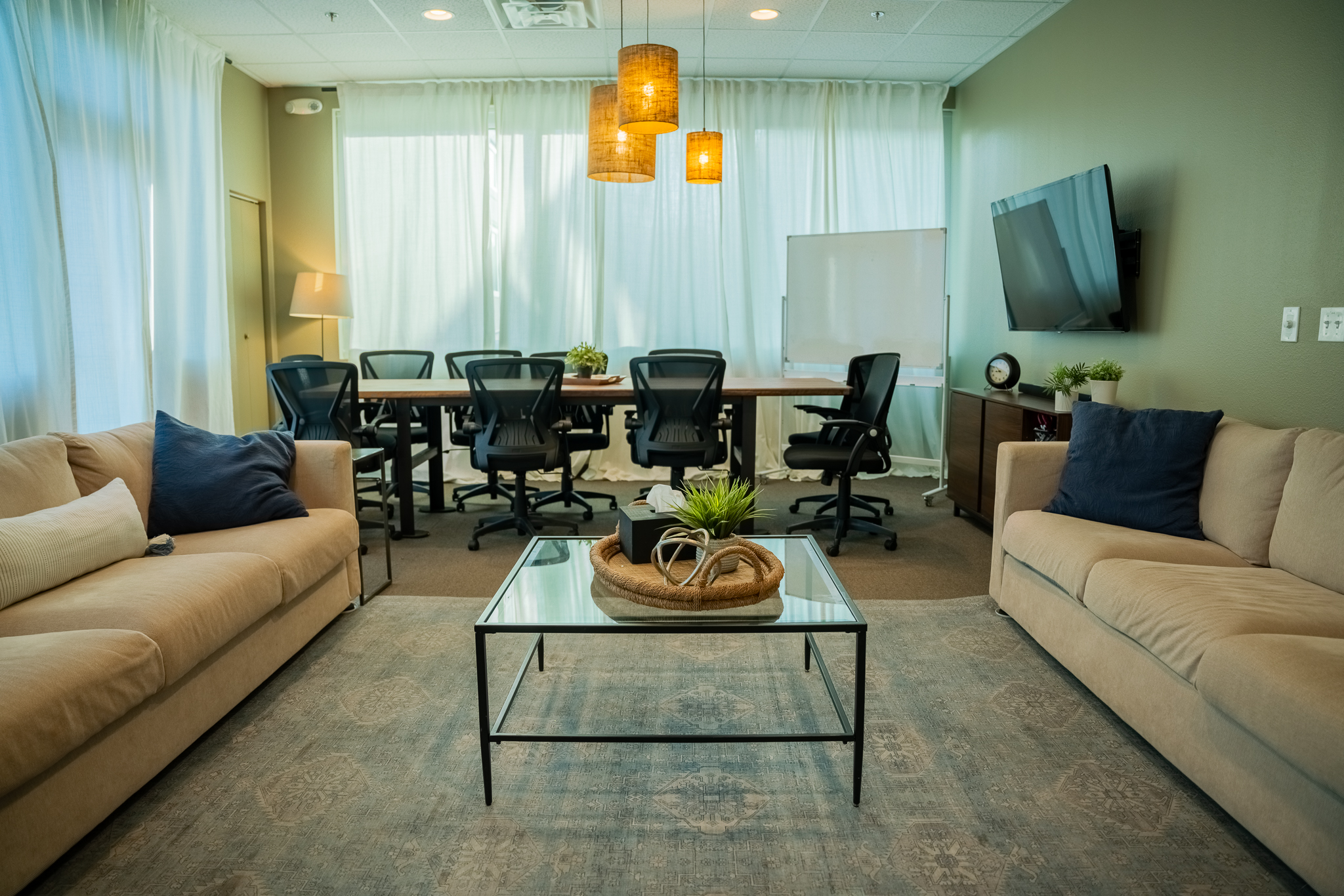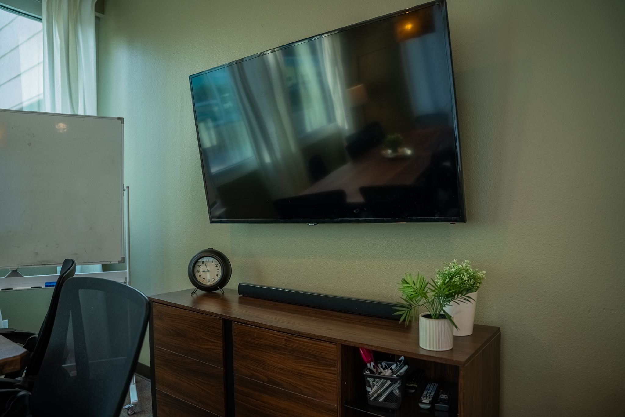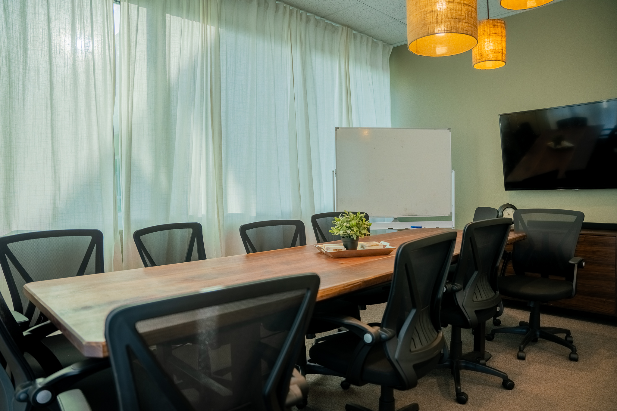The board meeting room is a great space for companies or groups looking for a small space to hold a meeting. This room has a table that seats 8, and two couches. The TV in this room has Apple TV connections.